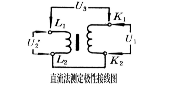 接线如上图所示,将电流互感器一、二次线圈的尾端L2、K2联在一起,在匝数较多的二次线圈上通以1~5V的交流电压U1,再用10V以下小量程交流电压表分别测量U2及U3的数值,若U3=U1-U2,则为减极性;若U3=U1+U2,则为加极性。