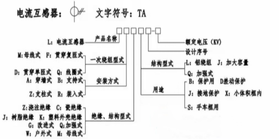 第一个字母L表示电流互感器;第二个字母表示一次绕组型式或安装方式;第三个字母表示绝缘、结构形式;第四个字母表示结构形式或用途。