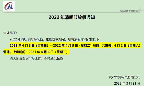 2022年清明节放假通知 全体员工: 2022年清明节即将来临,根据国家规定,现将放假时间安排如下: 2022年4月3日(星期日)—2022年4月5日(星期二)放假,共三天,4月2日(星期六)...
