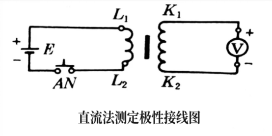 接线如上图所示,在电流互感器的一次线圈(或二次线圈)上,通过按钮开关AN接入1.5~3V干电池E。L1接电池正极,L2接电池负极。在二次线圈两端接以低量程直流电压表或电流表。仪表的正极接K1,负极接K2。当将按钮开关AN按下,电路接通时,若电压表或电流表指针正起,AN断开时,指针反起则为减极性。反之为加极性。直流法测定极性,简便易行,结果准确,是现场最常用的一种方法。
