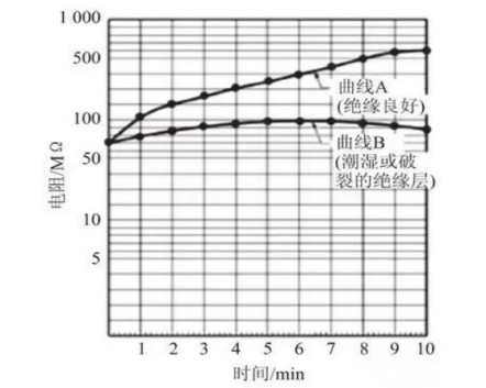 (3)通过分析测试图表的结果确定绝缘的状态。如图4中,曲线的斜率说明了绝缘的状态。良好的绝缘(曲线A)表现为电阻值的连续增长;潮湿或破裂的绝缘层(曲线B)表现为相对恒定的电阻。如果示值不能满足可接受的最小电阻,则需要维修电动机。极化指数是设备绕组的绝缘电阻之比,由10 min测量值除以1 min测量值计算得到。极化指数是绝缘状态的一个指示。低的极化指数(一般为1.5或更低)表明过于潮湿或污染严重。不同的绝缘等级具有不同的最小可接受极化指数值。绝缘等级是基于设施的连续工作温度。